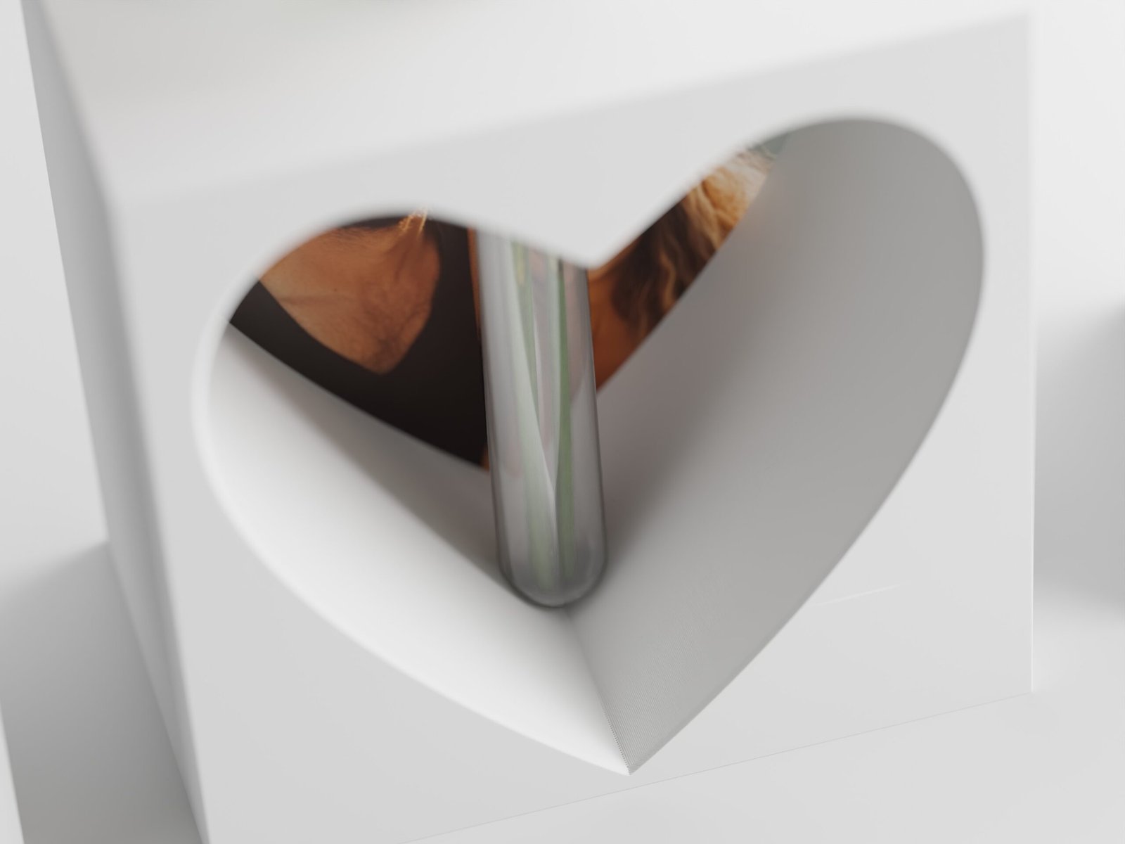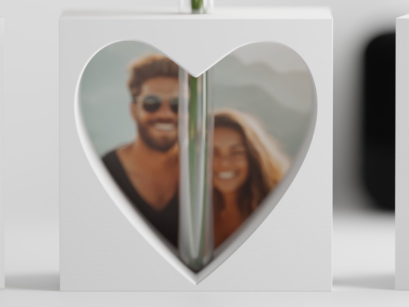 Una silueta de bloque limpia y moderna alberga un llamativo corte en forma de corazón que irradia elegancia. En la parte superior incluye un inserto para sostener un tubo de vidrio ideal para flores frescas. Para mayor comodidad, también se incluye una versión imprimible del tubo.